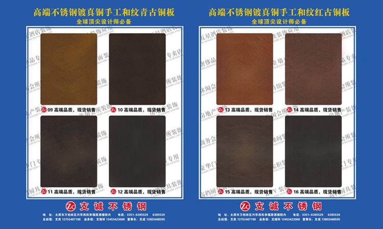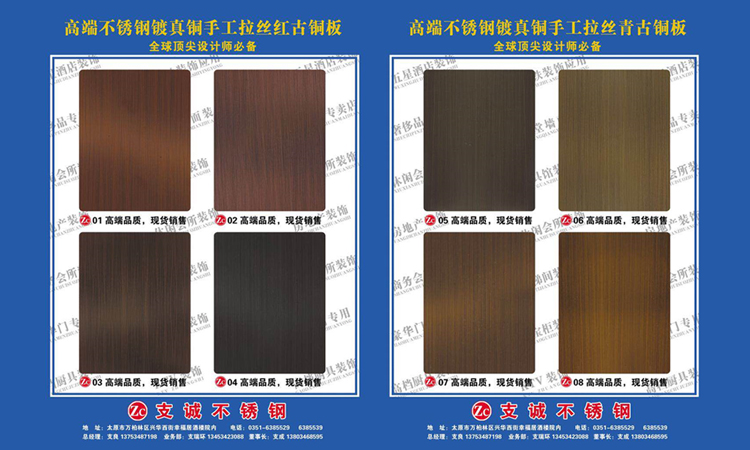 太原支誠不(bù)鏽鋼高(gāo)端闆材超市(s★÷δ☆hì):公司24種高(gāo)端鍍真銅闆手工(gōng)拉絲紅(hóng)古銅•>★、手工(gōng)拉絲青古銅、手工(gōng)亂紋紅(hóng)古銅、手工(gōng♥↓∏σ)亂紋青古銅 、做(zuò)舊(jiù)銅闆一(yī)級正材、可(kě)拉彎← 異形。